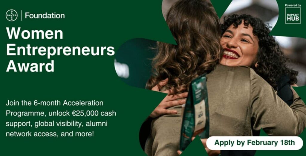 Across Asia Pacific, Latin America, Africa, and the Middle East, Bayer is seeking 15 women who are ready to scale their ideas and create sustainable change. If you’re working on innovative solutions to the world’s most pressing challenges in health and food security, now is the time to take your business to the next level.