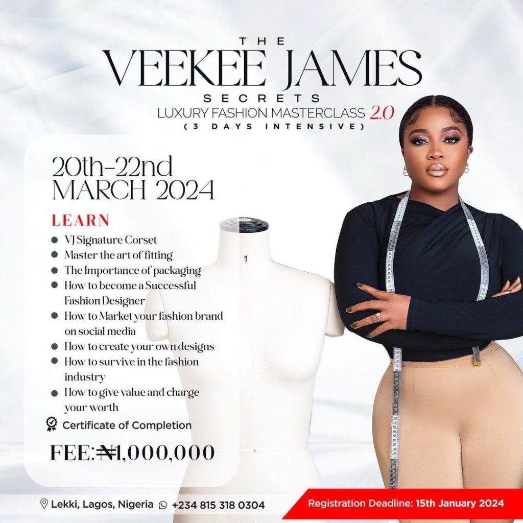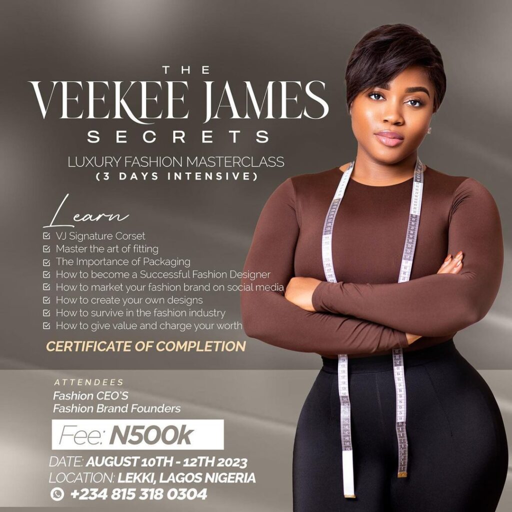Of her upcoming three-day masterclass class scheduled for March 2024, she says: “The 1st edition [August 2023] was life-changing, with so many testimonies. This edition promises to be even better! This is not a class for freshers! This is a class for Fashion Brand owners! The intent is that your fashion brand takes a different turn positively after this class! Let me teach you how to make a name in the Fashion Industry and make good money while at it!”