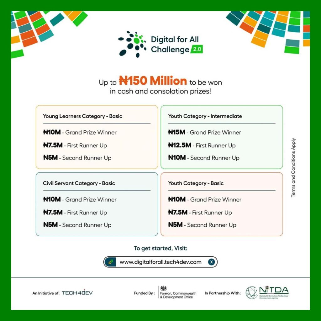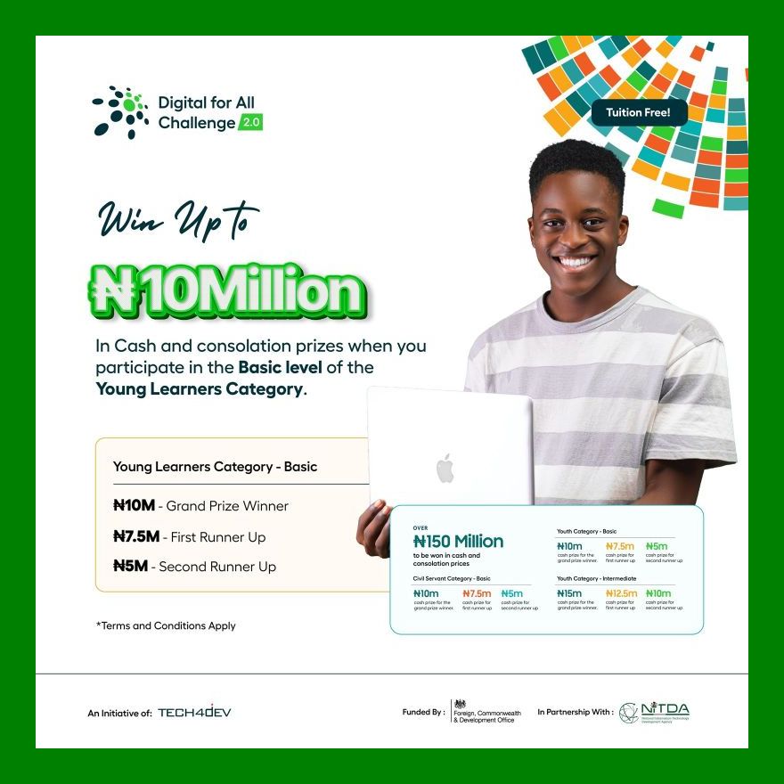 Ddesigned to empower Nigerians with in-demand digital skill, the DigitalForAllChallenge 2.0 is a unique programme that offers comprehensive learning tracks in Cybersecurity, Data Analysis, Digital Marketing, and Software Development.