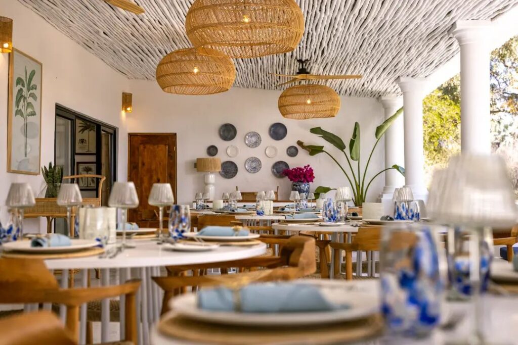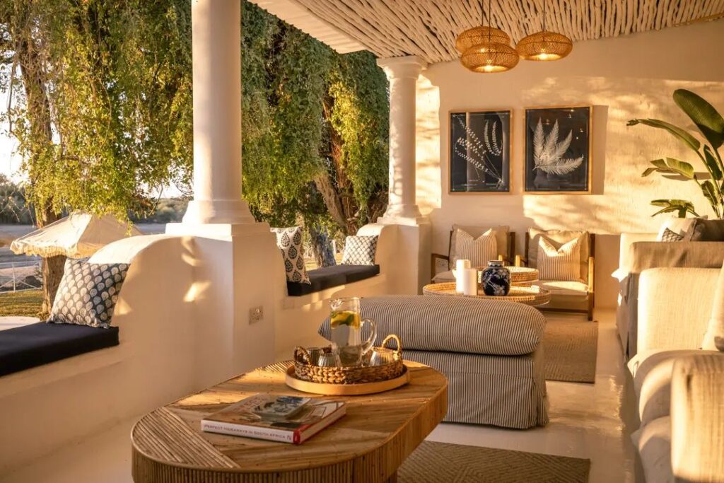The hotel features vast verandas overlooking grassy lawns and the river itself, welcoming guests to its northern Botswana safari experience.