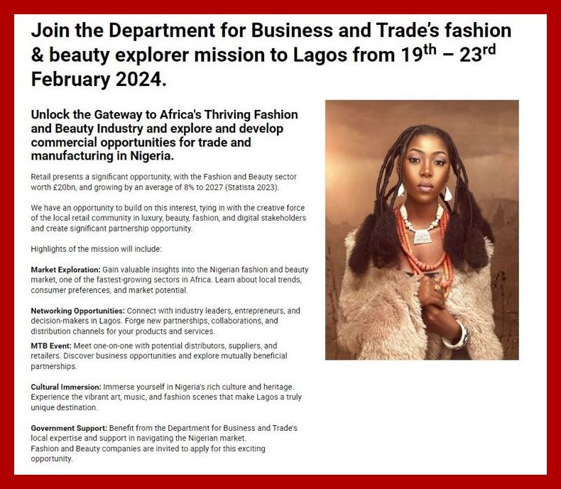 The Department for Business and Trade is making a last call to UK companies to join in on its explorer delegation to Lagos Nigeria in February, describing it as an “opportunity for to access this exciting and rapidly growing market”!