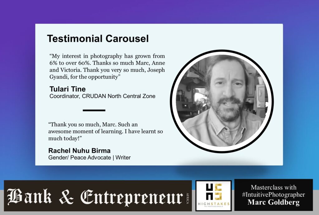 The two-hour Bank & Entrepreneur Photography Masterclass with Marc Goldberg held as scheduled on February 27, 2024.