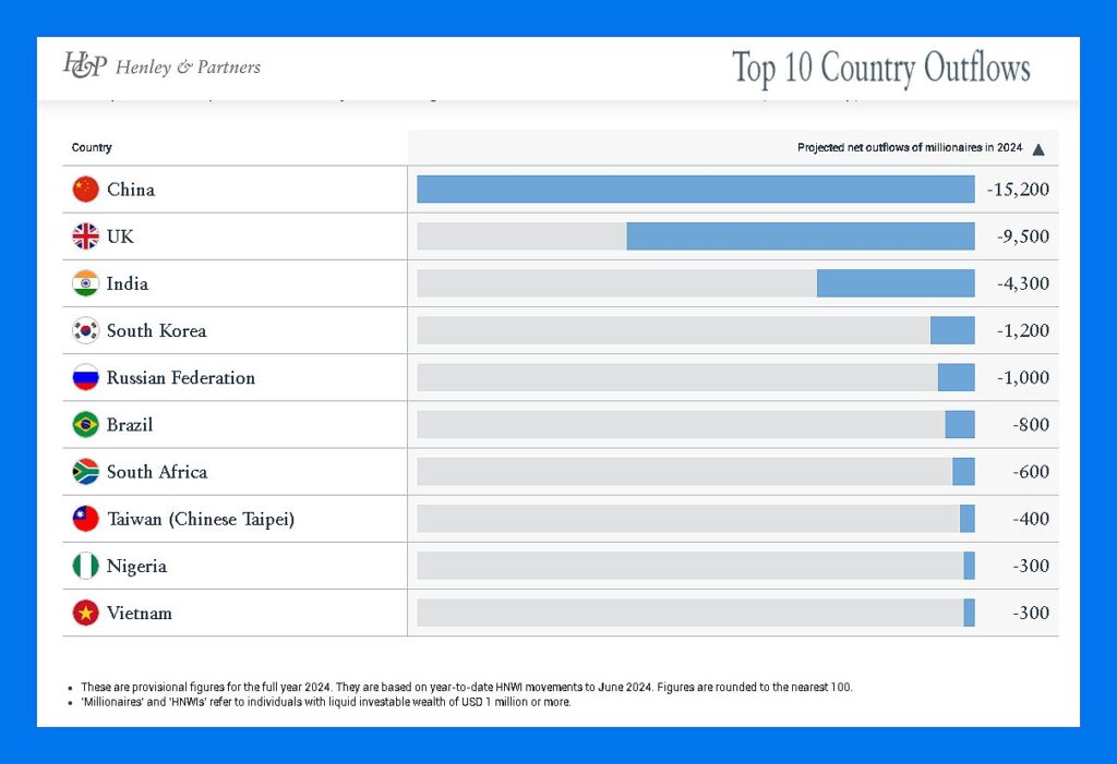 Besides China, the UK, India, South Korea, and Russia, the remaining places in the Top 10 millionaire outflow ranking are taken up by Brazil where a millionaire drain of 800 is projected this year, followed by South Africa (-600), Taiwan (-400), and Vietnam and Nigeria, which are both set to see 300 millionaires take flight.