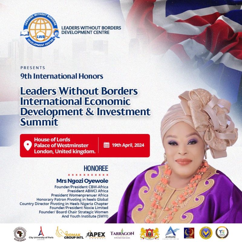 Ngozi Oyewole (Founder & CEO, Noxie Limited – amongst other leadership roles) is thrilled to announce that she has been selected as an Honoree at The Leaders Without Borders International Economic Development and Investment Summit 2024, which will be held at the Prestigious House of Lords, Palace of Westminster in London.