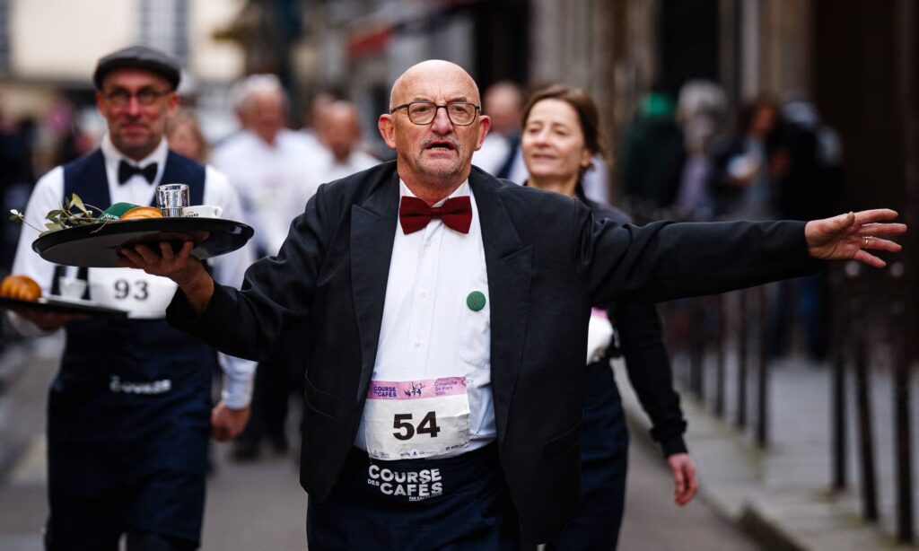 After a decade-long absence, the iconic “Course des Café” (“Café Race”), formerly known as the “Waiters’ Race”, returned to the heart of Paris on March 24. While the name has been updated for inclusivity, the essence of the event remains unchanged. This revival, however, has a dual purpose: to combat plastic waste and to celebrate the art of service in the midst of a bustling café scene.